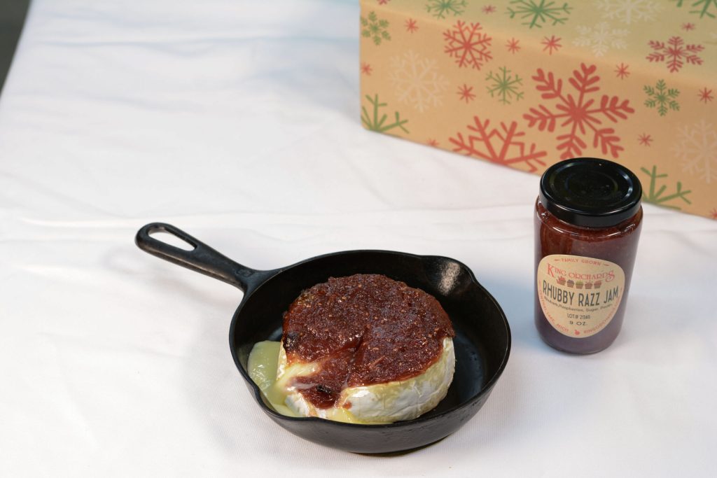 (1) small wheel of brie cheese (1) 9 oz. jar of KO Rhubby Razz Jam Pre-heat oven to 350 degrees. Place wheel of brie in oven safe pan. Top with KO Rhubby Razz Jam. Bake for 30 minutes or until desired doneness.