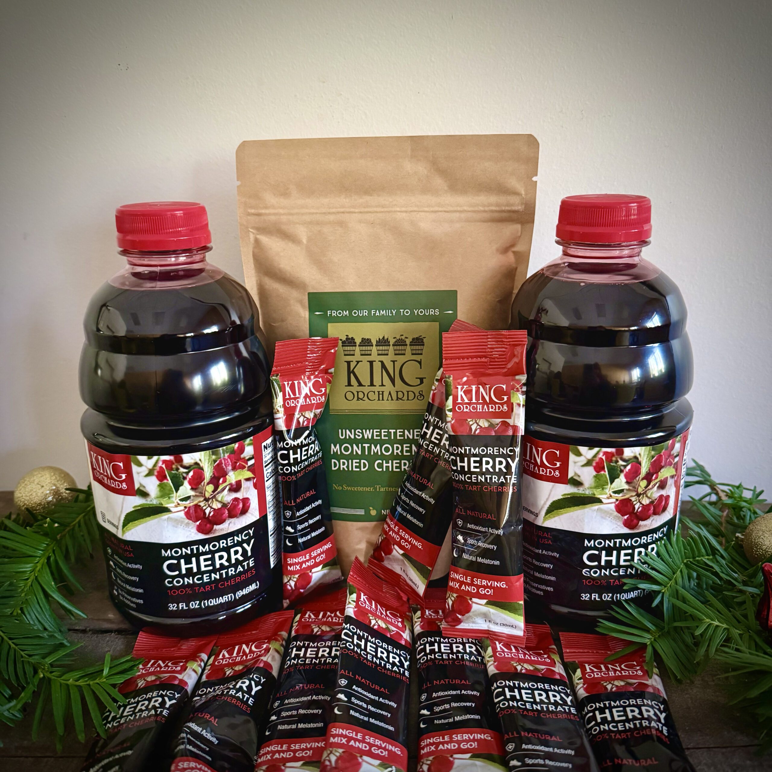 Stay energized with our Happy & Healthy Gift Box, featuring (2) 32 oz. bottles of tart cherry concentrate, (20) single-serve concentrate packets, and (1) 10 oz. bag of unsweetened dried cherries. A natural way to support recovery, sleep, and joint health — made from 100% Michigan Montmorency cherries.