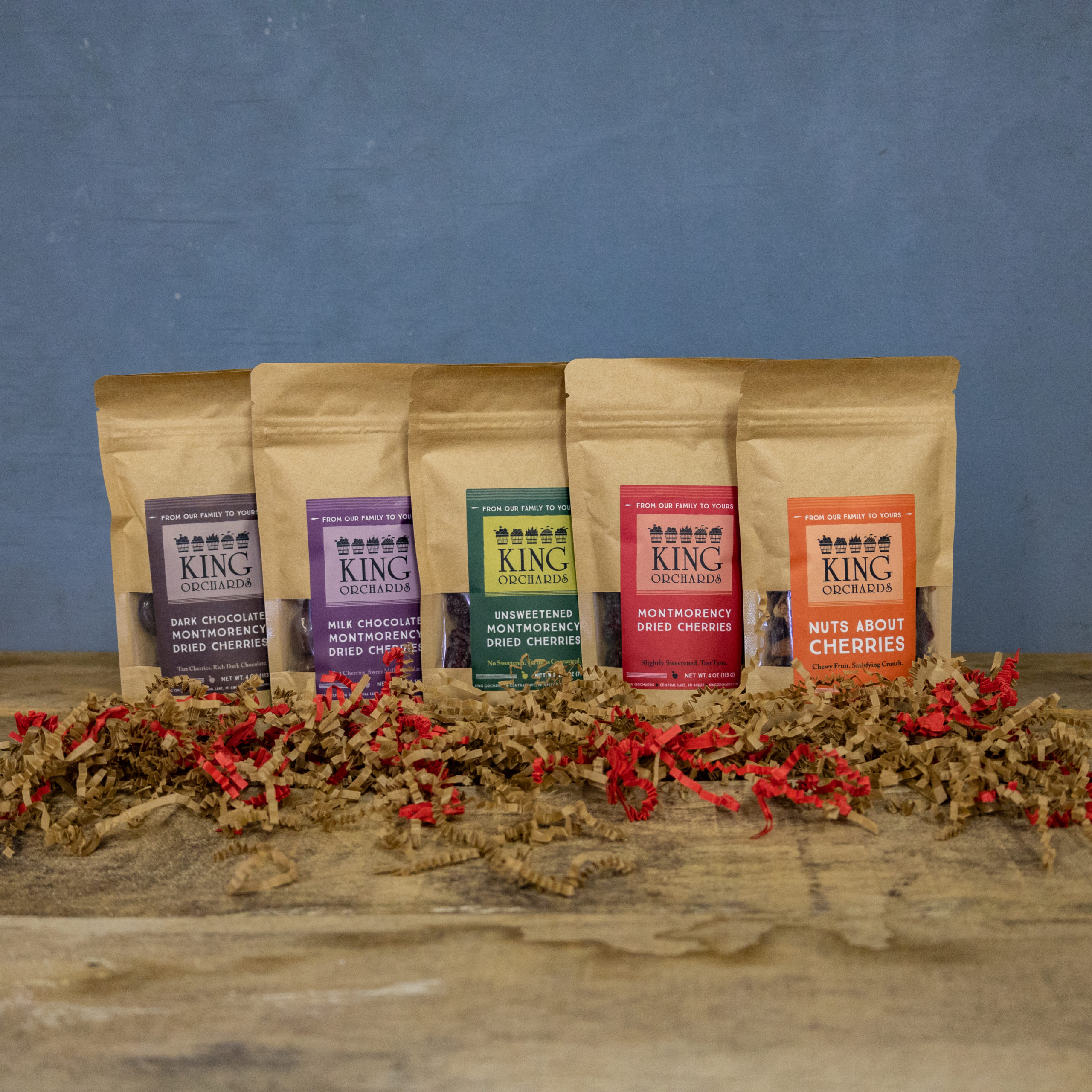(1 ea.) 4 oz. bag. of Milk Chocolate covered cherries, Dark Chocolate covered cherries, Traditional Dried cherries, 3 oz. bag of Nuts About Cherries, 2.5 oz. bag of Unsweetened Dried cherries